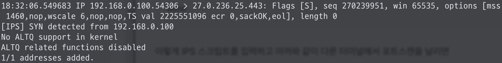 이렇게 IPS 스크립트를 입력하고 아까와 같이 다른 터미널에서 포트스캔을 날리면